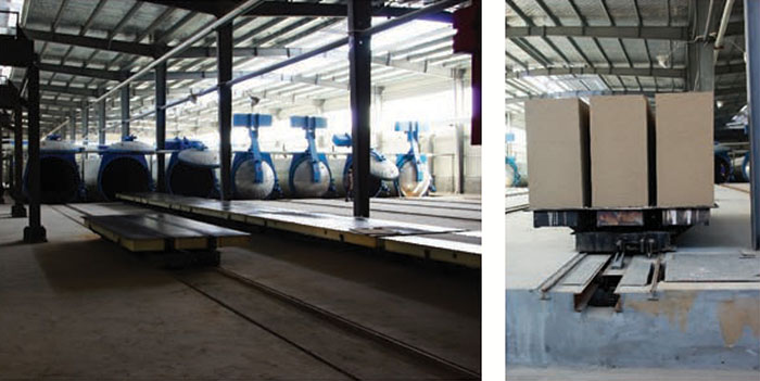 蒸養(yǎng)小車是生產(chǎn)過程中的專用運(yùn)輸車輛,其裝載著切割后的坯體,進(jìn)入蒸壓釜蒸養(yǎng)。蒸養(yǎng)后,將成品運(yùn)送至成品場地。成品雕吊卸后,蒸養(yǎng)車再次載坯體入釜蒸養(yǎng)。